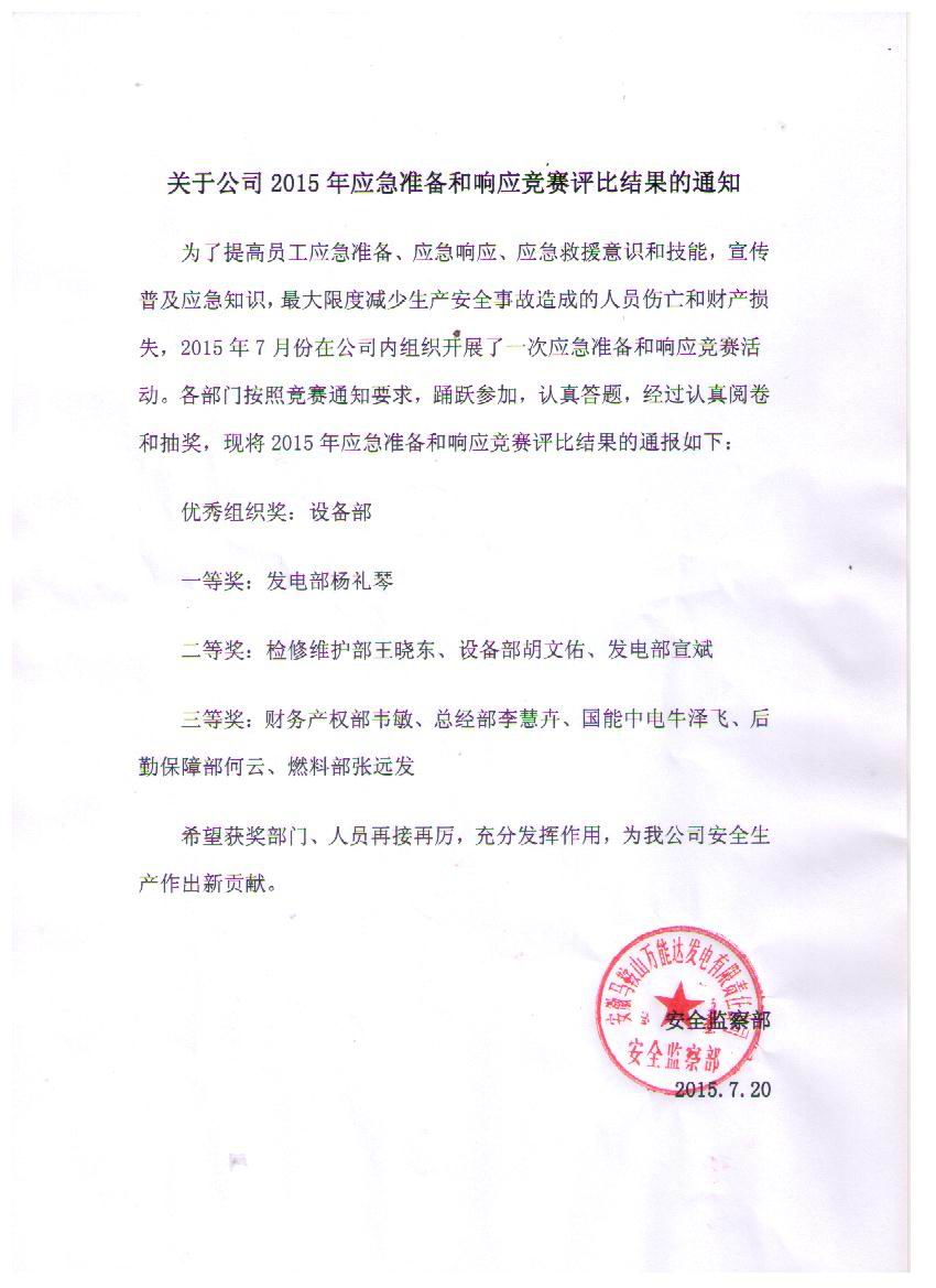 為了提高員工應急準備、應急響應、應急救援意識和技能,宣傳普及應急知識,馬鞍山項目部業主萬能達電廠于2015年7月組織開展了應急競賽,我公司牛澤飛獲得三等獎,牛澤飛是獲得獎項的唯一非電廠員工,牛澤飛的獲獎及展示了公司風貌,又體現項目的安全教育頗有成效,既了強化了員工的安全意識,也提高了員工處理應急突發情況的能力。