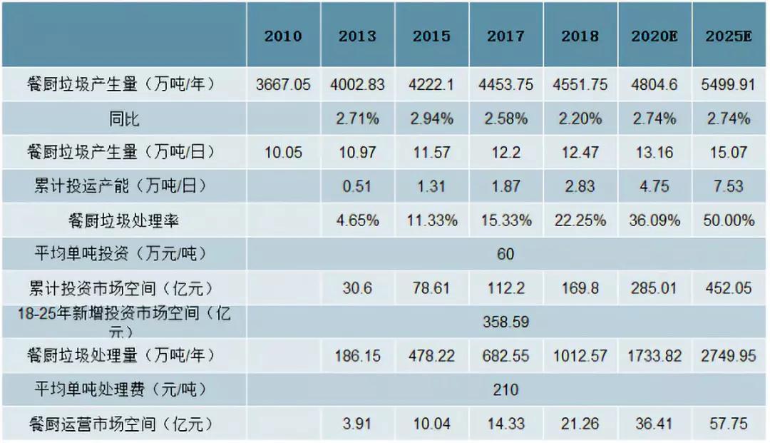 至2025年廚余垃圾投資市場超千億、運營市場空間可達146億。2017年全國地級及以上城市生活垃圾清運量為1.76億噸/年,為全國城市垃圾清運量的81.97%。采用中國再生資源回收利用協(xié)會數(shù)據(jù),假設(shè)廚余垃圾占生活垃圾的比重為56%,則估計全國地級及以上城市廚余垃圾清運量為27.07萬噸/日。