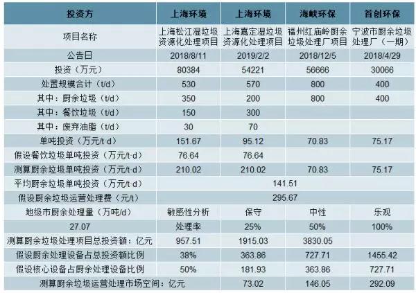 以100個餐廚垃圾試點城市的平均餐廚垃圾項目單噸投資額76.6萬元/t,處理費197元/t作為合理估計值,可得上海環(huán)境松江、上海環(huán)境嘉定、海峽環(huán)保福州、首創(chuàng)環(huán)保寧波(一期)4個項目的平均廚余垃圾單噸投資額為141.5(萬元/t)。考慮到廚余垃圾的綜合處理費較高,假設(shè)廚余垃圾處理費是餐廚垃圾的1.5倍為295.7(元//t•d),以地級及以上城市平均每天產(chǎn)生約27萬噸廚余垃圾測算,在中性情景下(即垃圾分類完成率為50%),廚余垃圾總投資額市場空間為1915億;按廚余垃圾處理設(shè)備占總投資額的38%,核心設(shè)備占廚余處理設(shè)備的50%計算,對應市場空間為364億;2025年廚余垃圾運營處理市場的空間預計可達146億元,市場空間廣闊。